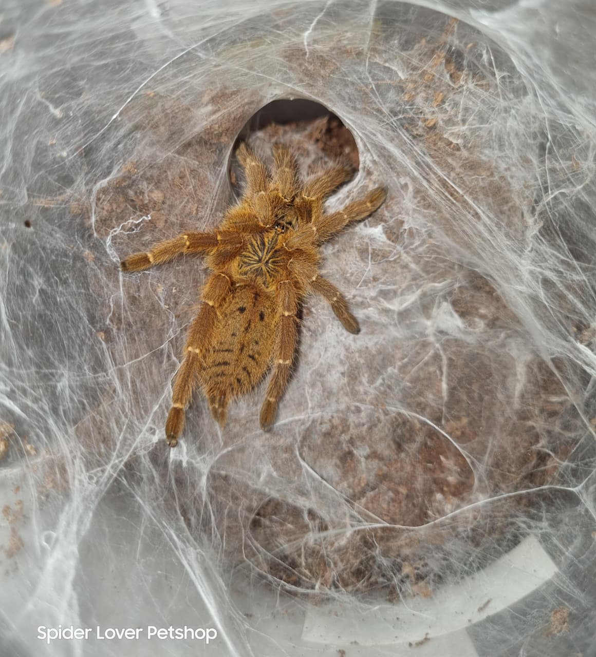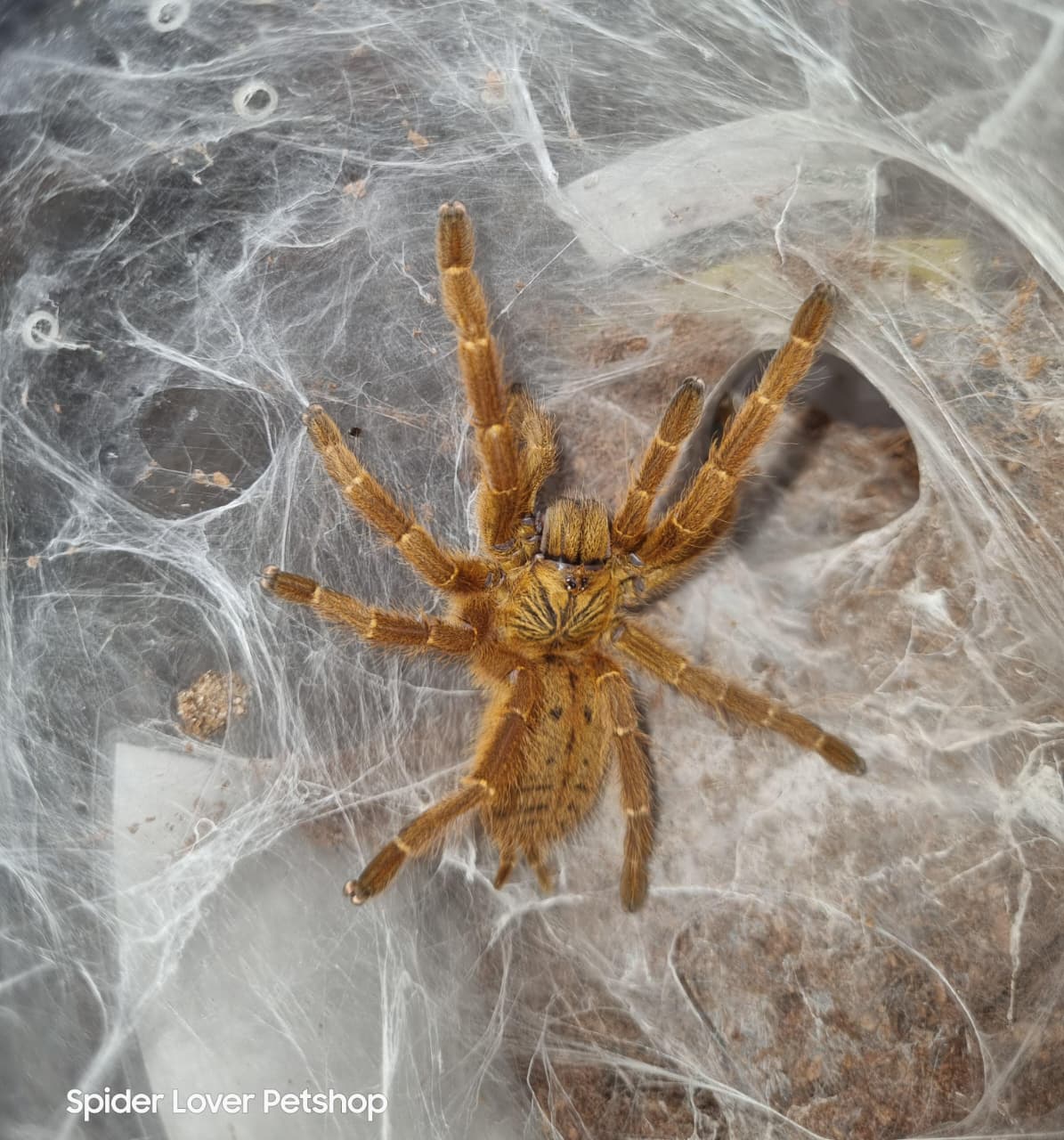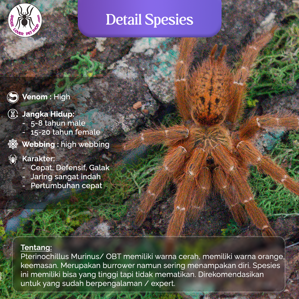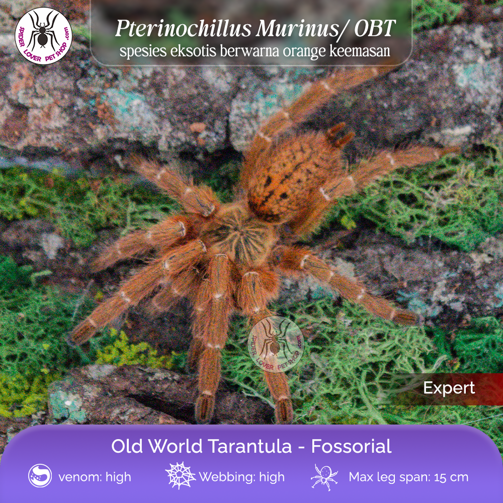 Behavior: Don’t be fooled by her beauty, as she is very defensive. The spider will try to flee at first. Persistent provocation can result in a bite, something you don’t want to happen. Pterinochilus murinus is known to make very beautiful webs as well, equiped with lots of entries and a long, either invisible web on the surface to locate prey quickly as they grow older. The webbings are a true pleasure to watch.