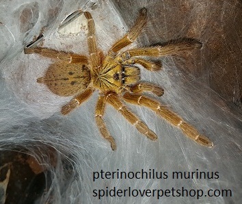 Behavior: Don’t be fooled by her beauty, as she is very defensive. The spider will try to flee at first. Persistent provocation can result in a bite, something you don’t want to happen. Pterinochilus murinus is known to make very beautiful webs as well, equiped with lots of entries and a long, either invisible web on the surface to locate prey quickly as they grow older. The webbings are a true pleasure to watch.