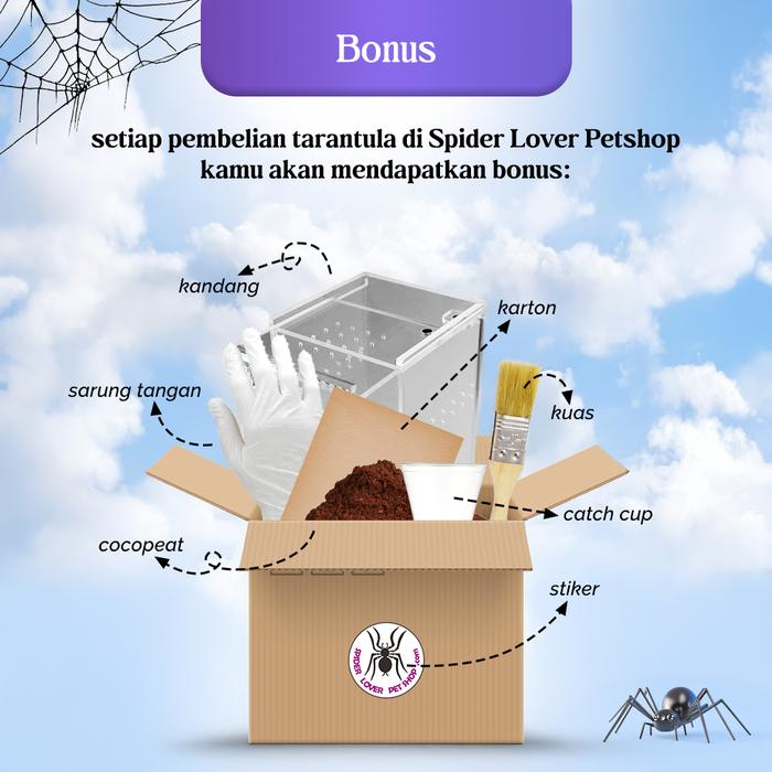 ● Starter kit seperti tempat dan cocopeat diberikan. Syarat dan ketentuan berlaku. Bonus tempat tidak dapat memilih. Jika menginginkan yang lebih baik silahkan dibeli di bagian tarantula enclosure. Mohon maaf kalau bonus lupa dimasukan.