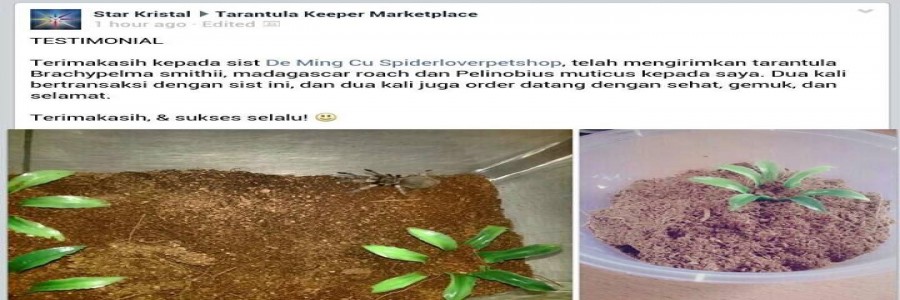 Thank you for De Ming Cu Spiderloverpetshop, telah mengirimkan tarantula Brachypelma Smithi, Madagascar Roach dan Pelinobius muticus kepada saya. Dua kali bertransaksi dengan sist ini, dan dua kali juga order datang dengan sehat, gemuk, dan selamat. Terima kasih & sukses selalu! J