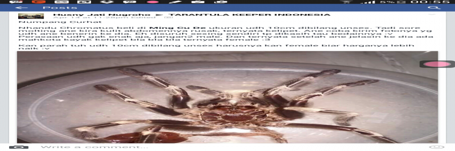 Nandhu Chromatus beli di Ming Cu De ukuran udah 10cm dibilang unsex. Tadi sore molting ane kira kulit abdomennya rusak, ternyata kelipet. Ane coba kirim fotonya yang udah ane benerin ke dia. Eh disuruh sexing sendiri tapi dikasihh tau bedainnya :v Perasaan udah gak enak aja, jangan-jangan male. Dan ternyata setelah ane jelasin ke dia ada mahkota kaya kelipet blablabla ternyata female :3